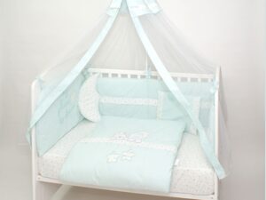 Set sadrži – jorgan – navlaku za dušek sa gumom pamučnu – ravan jastuk – ogradicu sa tri strane krevetića *BALDAHIN NE SPADA U CENU* Dimezije: 120×60 Zemlja porekla: Srbija